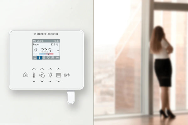Gracias a la comunicación Modbus inteligente (inalámbrica), los dispositivos también pueden integrarse perfectamente en los sistemas de gestión de edificios existentes. Rymaskon® impresiona por su aspecto de alta calidad, sus elegantes superficies en blanco y negro y una pantalla en color de alto contraste.