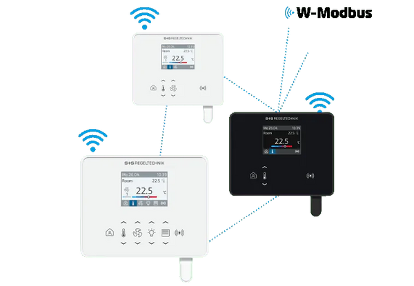 Gracias a la comunicación Modbus inteligente, los dispositivos pueden conectarse fácilmente en red o integrarse sin problemas en los sistemas de gestión de edificios existentes. Las unidades operativas de las habitaciones ponen los valores de consigna a disposición del BMS a través del Modbus cableado convencional o a través del Wireless Modbus inalámbrico basado en radio.