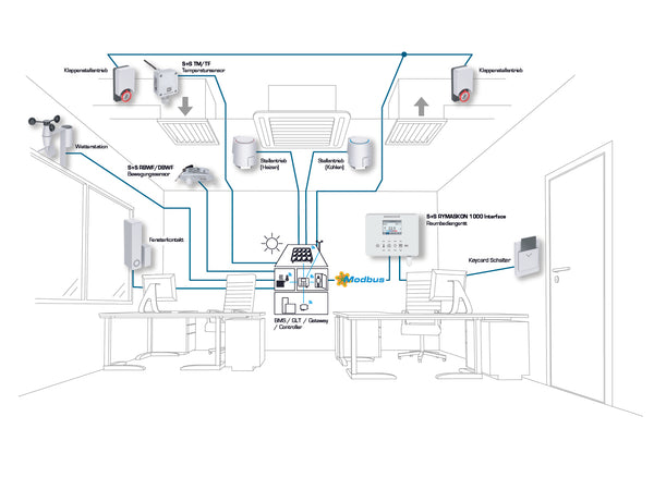 Rymaskon Las unidades de control de estancias están equipadas con sensores para medir la temperatura, la humedad y la calidad del aire con el fin de comprobar el estado actual de la estancia. Las unidades operativas controlan la calefacción, la refrigeración, la ventilación, el sombreado y la iluminación mediante comunicación Modbus con el sistema de gestión de edificios.