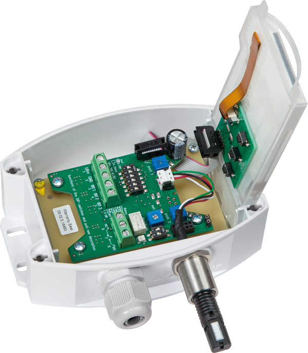 El aparato está especialmente diseñado para su uso en condiciones ambientales adversas (95...99 % HR). Se utiliza un sensor digital de humedad y temperatura estable a largo plazo con alta impermeabilidad (encapsulado IP 65). A partir de estas magnitudes de medición se calculan internamente los siguientes parámetros, que pueden consultarse a través de la salida OUT3: humedad absoluta, proporción de mezcla, punto de rocío y temperatura de bulbo húmedo (conmutable mediante interruptor DIP). Con la variante de aparato AFTF-45 LCD pueden mostrarse hasta tres parámetros en la pantalla (ajustable mediante interruptor DIP).