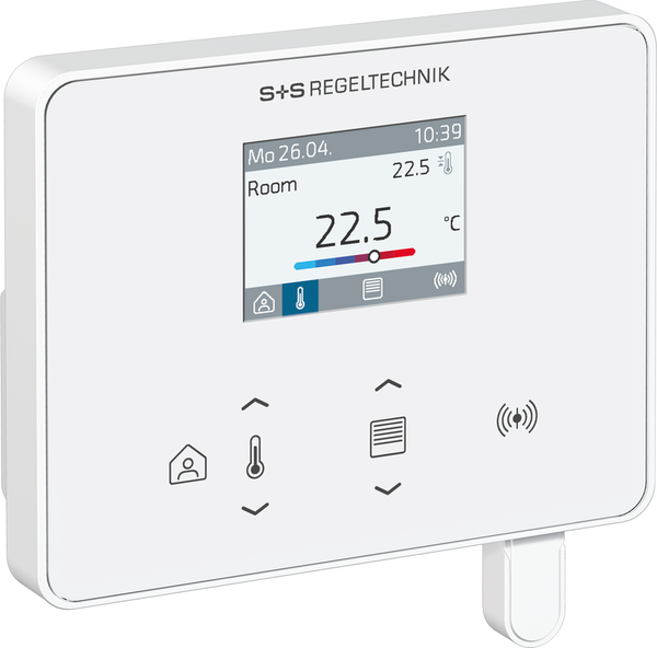 La interfaz de comunicación Modbus o W-Modbus permite modificar y supervisar en todo momento los parámetros climáticos del regulador a través del BMS. Además, las funciones de protección solar (persianas exteriores, persianas venecianas) o la luz (con función de regulación) pueden controlarse a través del bus. La visualización se muestra en una pantalla TFT de 2" y el manejo se realiza mediante botones capacitivos (teclas táctiles).