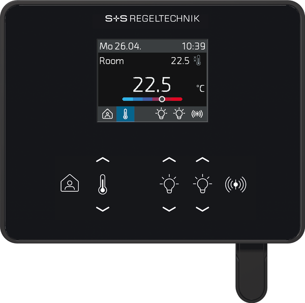 La interfaz de comunicación Modbus o W-Modbus permite modificar y supervisar en todo momento los parámetros climáticos del regulador a través del BMS. Además, las funciones de protección solar (persianas exteriores, persianas venecianas) o la luz (con función de regulación) pueden controlarse a través del bus. La visualización se muestra en una pantalla TFT de 2" y el manejo se realiza mediante botones capacitivos (teclas táctiles).