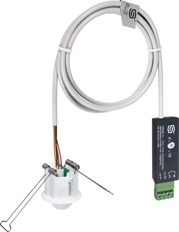 El sensor de movimiento del techo KINASGARD DBWF-C detecta la presencia de personas y movimiento y tiene como salida un contacto de conmutación (contacto NA). El detector de movimiento se utiliza para la supervisión, la detección de estados y el control en función del movimiento de las funciones de la habitación, por ejemplo, para bajar la temperatura en habitaciones no utilizadas.