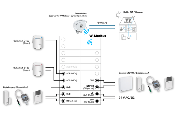 Además del sensor de temperatura y humedad integrado, hay disponibles sensores opcionales para CO2 y COV. También hay una entrada para un sensor de temperatura pasivo (NTC10K) y una entrada para un contacto libre de potencial. Por ejemplo, se puede conectar un contacto de ventana o un monitor de condensación. De este modo, se dispone de todas las opciones para una climatización flexible y personalizada de las estancias.