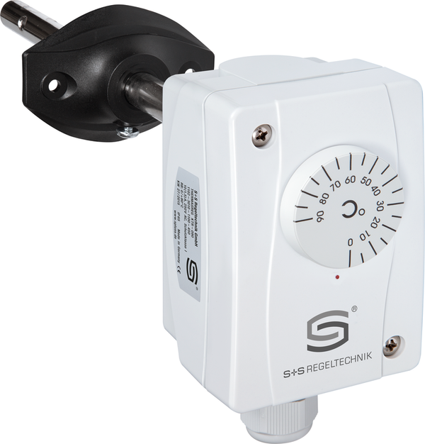 Regulador de temperatura mecánico/termostato de varilla THERMASREG KTR con salida de conmutación, que se utiliza para supervisar, controlar o limitar la temperatura de medios líquidos o gaseosos como regulador de calderas o en la tecnología de calefacción, ventilación y aire acondicionado, así como en la ingeniería mecánica y de aparatos y en los sistemas de generación de calor. El dispositivo está diseñado como regulador de temperatura regulable de una o dos etapas TRmonitor de temperatura TW o limitador de temperatura de seguridad STB.