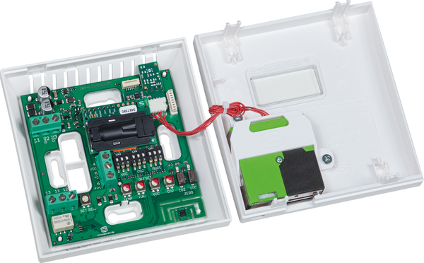 Sensor de temperatura ambiente multifuncional y sin mantenimiento AERASGARD RFTM - PS - CO2 - W con salida activa/conmutable, calibración automática, en una atractiva carcasa de plástico con tapa a presión, parte inferior con fijación de 4 orificios, opcionalmente con/sin pantalla, para registrar las magnitudes de medición humedad (0...100 % HR), temperatura (0...+50°C), partículas (0...50 / 100 / 300 / 500 μg/m³) y contenido de CO2 (0...2000 / 5000 ppm). El transductor de medición convierte la variable medida en una señal estándar de 0-10 V o 4...20 mA (conmutable).