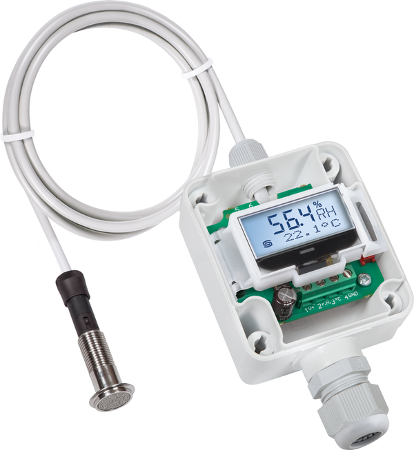 El sensor para vitrinas se utiliza en entornos no agresivos y sin polvo, y es especialmente adecuado para su instalación en techos, paredes, vitrinas o escaparates de museos, galerías, cines, salas de conferencias o laboratorios. El elemento de medición se encuentra en una sonda de acero inoxidable y apenas es perceptible gracias a su escasa altura (aprox. 2,5 mm).