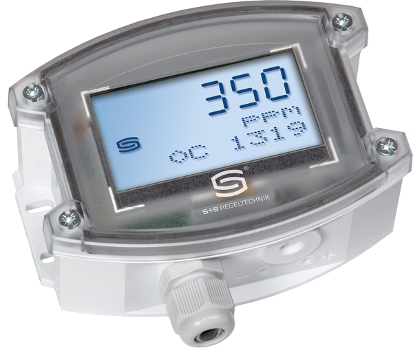 Sensor de superficie sin mantenimiento AERASGARD ALQ - CO2 - W con salida activa/conmutable, calibración automática (desconectable), en carcasa de plástico resistente a los golpes con tornillos de cierre rápido, opcionalmente con/sin pantalla, para determinar el contenido de CO2 del aire (0...2000 ppm / 0...5000 ppm), la calidad del aire o la calidad del aire en tres niveles de sensibilidad a COV (bajo/medio/alto), la temperatura (-35...+80 °C) y la humedad relativa (0...100 % h.r.). El transductor de medición convierte las variables medidas en una señal estándar de 0-10 V o 4...20 mA (conmutable).