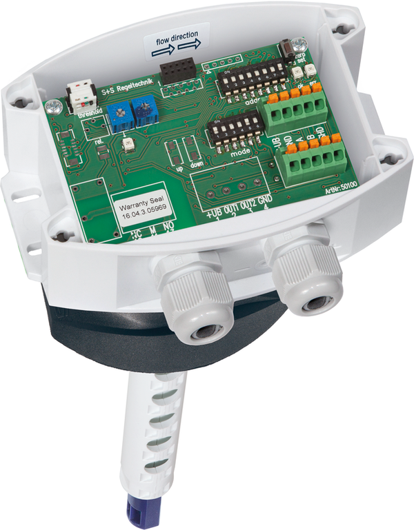 Sensor de caudal de aire en conductos calibrable RHEASGARD® KLGFVT - Modbus con conector Modbus, carcasa de plástico resistente a los golpes con tornillos de cierre rápido, con prensaestopas (conector M12 opcional según DIN EN 61076-2-101) opcionalmente con/sin pantalla, para determinar la velocidad del caudal (0,1...20 m/s) y la temperatura (0...50 °C).