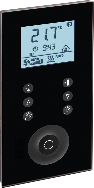 La pantalla multifuncional diseñada especialmente para el funcionamiento en habitaciones es regulable y ofrece una visualización clara de todos los datos disponibles de la habitación mediante símbolos intuitivos. Además de la hora, el día de la semana y los parámetros climáticos (temperatura, humedad, punto de rocío, contenido de CO2), también se pueden visualizar otras funciones, como la calefacción/refrigeración y el funcionamiento del ventilador, la ventana abierta, la iluminación, la alarma, el bloqueo de teclas o la ocupación de la habitación.