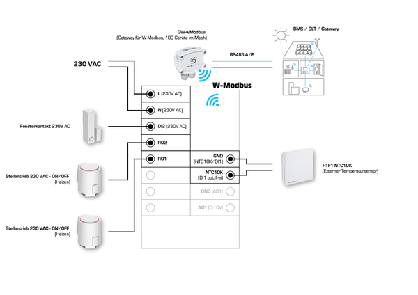 Además del sensor de temperatura y humedad integrado, hay disponibles sensores opcionales para CO2 y COV. También hay una entrada para un sensor de temperatura pasivo (NTC10K) y una entrada para un contacto libre de potencial. Por ejemplo, se puede conectar un contacto de ventana o un monitor de condensación. De este modo, se dispone de todas las opciones para una climatización flexible y personalizada de las estancias.